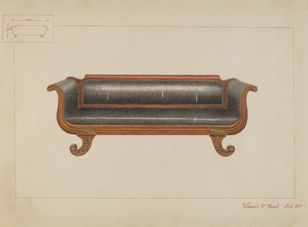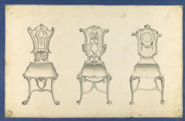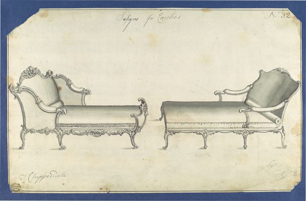 Editor: Here we have "Sofa, in Chippendale Drawings, Vol. I" created by Thomas Chippendale around 1759. It's a drawing, a print made with pencil and coloured pencil that depicts, well, a sofa. I find it remarkably elegant. What stands out to you when you look at this piece? Curator: Ah, Chippendale! He wasn’t just crafting furniture; he was composing fantasies for the fashionable drawing-rooms of his day. To me, this isn't simply a sofa design; it's a glimpse into the aspirations of the 18th century, a society poised between tradition and burgeoning Neoclassicism. I see flourishes of Rococo delicacy meeting the stoic lines of a new era. Notice the almost playful ornamentation balanced by that strong, horizontal form. Editor: I see what you mean about the balance! The legs feel so light, almost like they’re dancing, but then the back is solid and grounded. Was this sort of detailed drawing typical for furniture design at the time? Curator: Absolutely! These drawings were, in essence, marketing tools. Chippendale wasn't just selling furniture; he was selling a lifestyle, an aesthetic, and *access* to sophisticated taste. These renderings had to be both aspirational and precise, capturing the imagination of the client while ensuring the craftsmen could execute the design. Almost like a high-fashion sketch... but for your parlor. Makes you wonder about the conversations that happened around them, doesn't it? Editor: Definitely. I guess I never really considered the role of drawings like this beyond just technical instruction. Now I see they’re these fascinating little time capsules of style and aspiration! Curator: Precisely! It’s like stumbling upon a secret language of design. Next time you see one of these, try imagining the room, the people, the hushed whispers of "oh, how perfectly *en vogue*!"