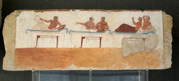 Editor: Here we have a fresco fragment dating back to 470 BC, entitled “Tomb of the Diver in Paestum, Italy: East Wall.” I'm struck by how informal it feels, almost like a snapshot of a banquet. What do you see in this piece, looking at it from a historical perspective? Curator: It’s tempting to see informality, but we must be wary of projecting modern notions. These images functioned within very specific funerary rites. Ask yourself, what purpose did such imagery serve for the patrons and viewers of the time? How does depicting a symposium inside a tomb change the very perception of it? Editor: That’s a good point. So, it’s not just decoration; it's about the function it played. The symposium scene perhaps was intended to comfort, by evoking a sense of celebration instead of mourning. Curator: Precisely. It provides us a peek into ancient Greek customs, ideas of afterlife, and status symbols that existed in this time. What does a symposium—exclusive drinking parties that served as important venues for socio-political networking—in a tomb tell us about societal concerns during the 5th century BC? It underscores the complex role of art, then and now, to both reflect and shape our values. Editor: So, by showing this familiar scene, maybe they’re trying to negotiate death, framing it as part of continued social life? Thanks, this helped me see it wasn't just an artistic scene but actually reflects historical cultural contexts of Ancient Greece. Curator: And it reminds us that our interpretations are always shaped by the institutions and assumptions we bring to the work. Keeps me on my toes, too.