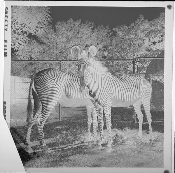Curator: Here we have Jack Gould's "Untitled (two zebras at zoo)," a small gelatin silver print, only about six by six centimeters, housed at the Harvard Art Museums. Editor: Striking! There's a ghostly quality to it, with the inverted tones—it almost feels like a dream sequence or an apparition. Curator: The reversal certainly emphasizes the graphic nature of the zebra’s stripes, playing with positive and negative space. Look at how the fence bisects the frame, creating layers. Editor: And the composition draws the eye from the front zebra, so calm and direct, to the one behind it, partially obscured, giving a sense of depth. It makes me think about confinement, yet a strangely beautiful one. Curator: Yes, perhaps Gould is inviting us to consider the tension between the wild and the captive, the seen and the unseen. Editor: It's a powerful statement packed into such a small frame, isn't it? Curator: Absolutely; it leaves you pondering the nuances long after you've walked away.