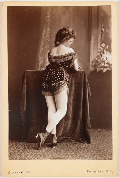 Curator: Oh, this one has such a theatrical flair. The image is called "Madge Lessing, from the Actresses series," printed around 1890 by Kinney Brothers. They were promoting their Sweet Caporal Cigarettes with these, a little slice of Victorian-era celebrity culture. What do you think, straight off the bat? Editor: Immediately, it’s the pose—so poised, yet undeniably coy. And the lighting! It feels almost like a staged performance captured mid-act. I sense a tension between artifice and perhaps, a forbidden allure, which considering it was meant for cigarette packets, is perhaps no accident. Curator: Absolutely. These albumen prints, tucked into cigarette packs, made actresses accessible to a broad public, though arguably in a controlled, commodified way. It is interesting, this form of erotic art using celebrity portrait. Editor: It’s fascinating to think of it in that light—celebrity worship meets mass marketing, all filtered through the lens, quite literally, of burgeoning consumer culture. Lessing, the actress, becomes an object, a symbol... of what exactly? Curator: Of aspiration, maybe? Or rebellion, in a way? Actresses at that time occupied a slightly subversive space. By purchasing those cigarettes, people bought into a world of perceived glamour and freedom, even if fleetingly. The historical context—how societal norms influence these images—is crucial, isn't it? Editor: Absolutely. This small portrait speaks volumes. It’s not just about a pretty face; it's about how beauty, fame, and commerce intertwined in the late 19th century. The theatre was a great locus of social possibility. I wonder who bought those cigarettes, though, young bucks trying to emulate masculinity? Women enjoying transgression in public? Curator: Likely both, and everyone in between. And it prompts the question: What would Madge Lessing herself have thought of this mass dissemination of her image? It is definitely one way to be remembered and considered even to this day. Editor: Indeed. I'm still caught up in that careful composition, with its calculated yet seductive pose. It is truly a perfect blend of business and art! Curator: A Victorian entanglement of art and commerce that’s more complex than one might think. Thanks for walking through this with me. Editor: My pleasure, It’s fascinating how something so small can illuminate so much!