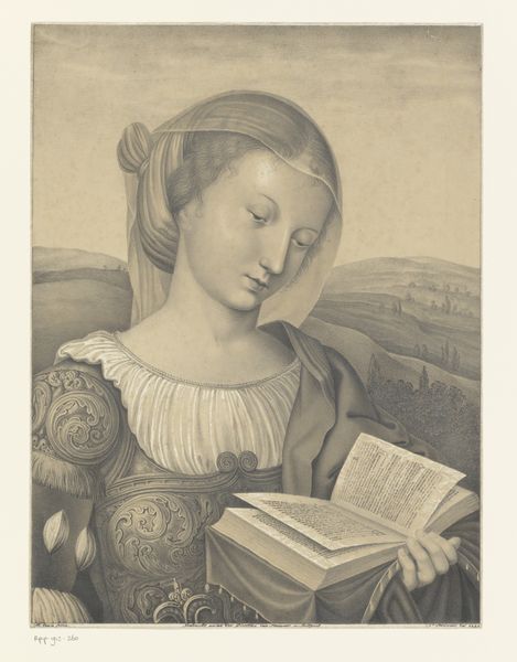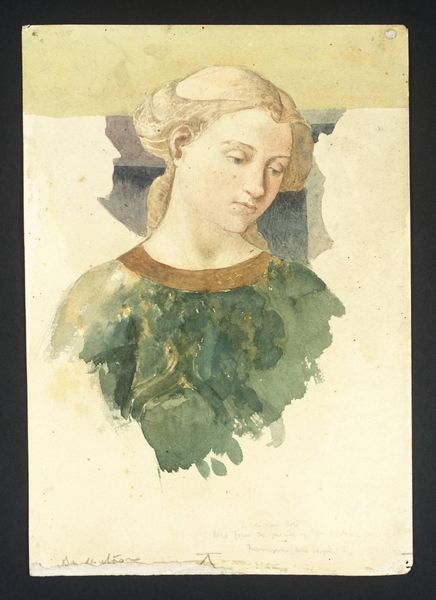 Editor: We’re looking at "Brustbild einer Heiligen mit Palme," or "Bust of a Saint with Palm," by Marie Ellenrieder. It's a watercolor and pencil drawing on paper. What strikes me is its ethereal quality. How would you interpret it? Curator: Indeed, the ethereal quality speaks volumes. The palm she holds isn't merely botanical; it’s a symbol of triumph, specifically martyrdom or spiritual victory. The halo, of course, reinforces this. Notice her gaze, directed upwards and away - where do you think her focus lies? Editor: Perhaps she’s contemplating her faith, or the divine reward awaiting her? Curator: Precisely. This upward gaze, paired with the palm, taps into a long cultural memory of saints and martyrs, of sacrifice and reward. Ellenrieder uses these symbols to evoke not just religious piety, but the psychological landscape of devotion. What emotional impact does that generate? Editor: I think it suggests a sense of serenity. A calm acceptance. Almost an idealized form of femininity. Curator: Consider too the Romantic context in which Ellenrieder worked. Artists sought to express inner emotional and spiritual states. She gives us not just a saint, but a study in the psychology of religious conviction, using the visual shorthand that viewers of the time would immediately recognize and internalize. Editor: It’s amazing how much meaning can be packed into seemingly simple symbols. Curator: Absolutely. These images worked on multiple levels, reinforcing cultural values and exploring profound human emotions through a universally understood symbolic language. It invites contemplation on faith, conviction, and the stories we tell ourselves about achieving salvation. Editor: I will never look at a palm leaf the same way again! It's much deeper than a simple plant. Curator: It shows us how a simple object in a painting is laden with historical, cultural, and personal significance.