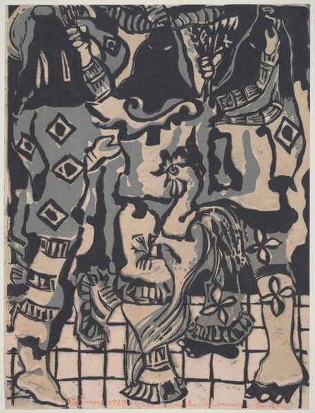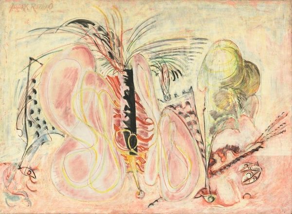 Curator: Marc Chagall created this vibrant piece titled "Small Composition for John" in 1957, employing watercolor and ink to bring his distinctive vision to life. Editor: Whoa. It's a little overwhelming at first glance, almost like a beautiful explosion on paper! There’s so much going on. The colors kind of bleed into each other, yet the black outlines give it this strange sort of... structure. Curator: Indeed. Chagall often intertwined personal and cultural narratives. Considering its post-impressionist and expressionist styles, we can examine how the political climate and artistic experimentation shaped his choices in figuration and landscape portrayal. His distinct dreamlike visual language created through form and symbolism might serve as a critical dialogue to understand this period. Editor: Dreamlike is the perfect word! The more I look, the more I see a sort of playful chaos. Is that a rooster in the middle? And there's a face... or part of a face... tucked on the left, almost hidden by the leaves. It reminds me of stumbling upon a secret garden populated by strange and wonderful creatures. It almost feels... childlike, but knowing it’s Chagall, I assume there is also much depth behind that first impression. Curator: Absolutely, viewing this piece, we might delve into themes of identity, displacement, and the integration of folk traditions within modernist art. The role of symbolism, particularly the rooster—a recurring emblem in Chagall's work representing vitality or even a connection to his Russian-Jewish heritage—provides a window into his broader commentary. Editor: Thinking about folk traditions... yes! It does have that sense of storytelling, doesn't it? Like a page torn from an old fairytale book, full of symbolic meanings. It has a weightlessness despite all the figures overlapping; an otherworldly atmosphere! The use of watercolour and ink gives a beautiful ethereal feel to the work. Curator: Analyzing how gendered dynamics and power intersect with themes in his composition enhances our understanding of the narratives Chagall constructs. By interrogating who 'John' is in relation to the visual narrative, we might consider a multifaceted range of interpretations about artistic legacy and reception in a changing world. Editor: Legacy is an interesting point! It also kind of prompts a response: I want to pick up my brush and paint something messy and exuberant and utterly, unapologetically "me". I guess great art has the power to light your fire... isn’t that part of the legacy in itself?