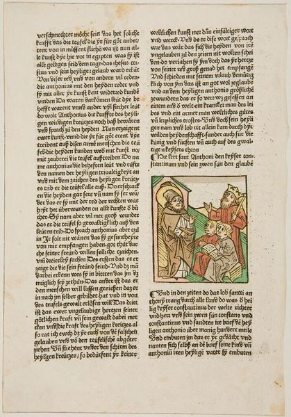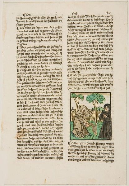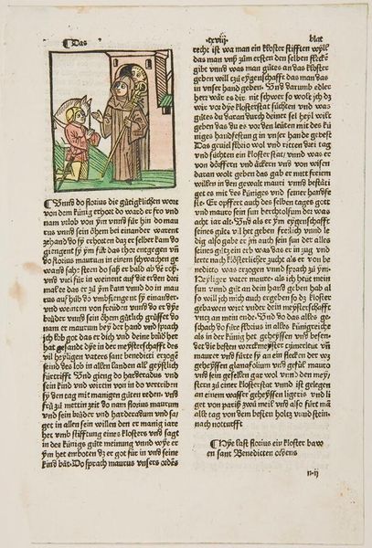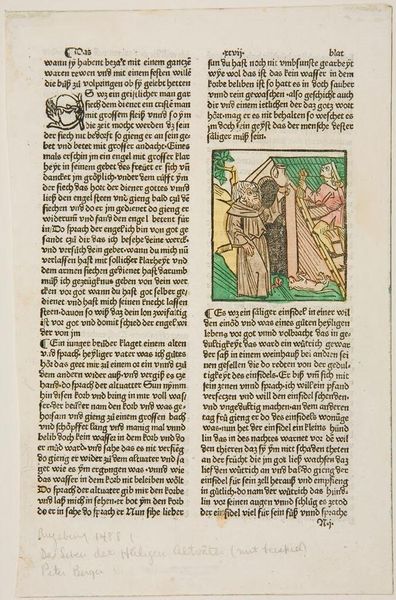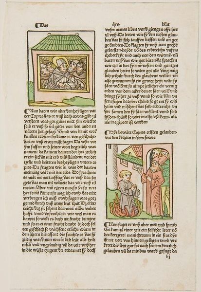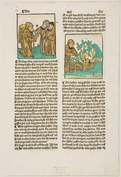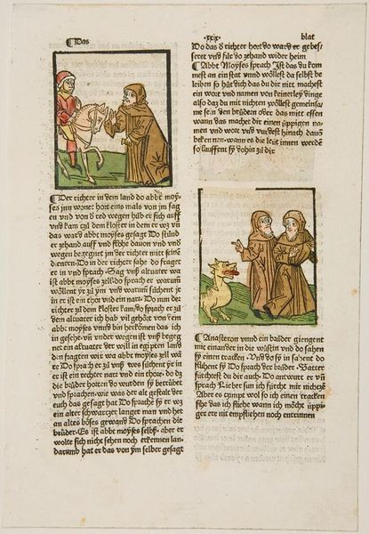 Curator: Let's turn our attention to this intriguing, though anonymous, 15th-century woodcut: "Friars going to St. Anthony; Friars instructing a Hunter to shoot an arrow," currently held at the Harvard Art Museums. What strikes you about it initially? Editor: The stark contrast between the crisp black lines and the areas of hand-applied color gives it a dramatic, almost theatrical feel. It’s so visually compressed, bursting with activity. Curator: Absolutely, it presents two scenes – one of friars journeying, another where they encounter a hunter. It speaks to the labor involved in both the spiritual and material aspects of life in that period. Editor: This is more than just labor; it's about power dynamics. The friars, figures of authority, intervening in the hunter's craft is a very pointed commentary on the church's influence. Were these pieces of art intended for a wider audience or to act as illustrations in a book? Curator: Such pieces were often disseminated widely, serving as accessible visual narratives for a broad audience, not unlike the role of printed pamphlets. Editor: So the very act of printing and distribution then becomes a means of challenging established norms, opening up dialogue about faith, and perhaps even critiquing the elite through accessible imagery. Curator: Precisely, examining the visuality allows us to understand how this woodcut functions within the social and material conditions of its creation and reception. Editor: Indeed, it is quite revealing. This simple print unlocks complex stories about faith, labor, and control.
