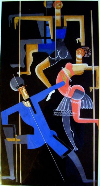 Editor: This is "The Secret" by Richard Lindner, painted in 1960. It feels theatrical, like a scene from a play. The geometric figures seem suspended in their own worlds, disconnected somehow. What symbolic meanings can we unpack here? Curator: The title itself, "The Secret," hints at hidden narratives. Lindner often explored themes of power dynamics and sexuality, especially within the urban landscape. Note the characters' almost costume-like attire; these aren't everyday clothes, but rather uniforms that signal roles. Editor: Roles in what sense? Is the rope a symbolic connector, or barrier? Curator: I see the rope less as a connector and more as defining the boundaries of a ritual or game. Look at the colors: vibrant, yet slightly jarring. This reflects the fractured nature of modern identity, the masks we wear. The man seemingly trapped near the wall; is it possible that suggests suppression or self-imposed limitation? Editor: I see the figures, the colours, the forms and I want to know what message, emotion or concept, this 1960 painting carries from history. Curator: Consider the pop art context of the era. The embrace of the flattened, almost cartoonish style, contrasts against darker undertones of postwar anxieties. The work presents a coded dialogue about cultural unease through highly stylised visual cues. Editor: So, beneath the surface, this image encapsulates a particular moment and social observation in history, right? Curator: Precisely. The symbols condense the experience and trauma into visually accessible form for the viewer. Editor: It’s like reading a complex story through a kaleidoscope of forms and colors. That really opens up a fresh line of thought!