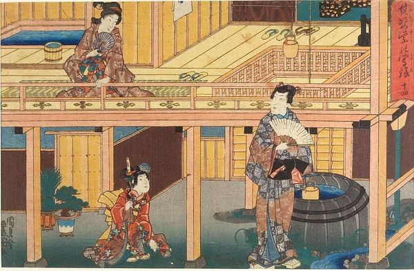 Editor: This is Utagawa Hiroshige's woodblock print, "Act One (Daijo), from the series The Storehouse of Loyal Retainers," a horizontal piece with a tranquil atmosphere. What catches my eye is the visible layering and the texture, which I know comes from the printing process itself. How do you interpret the materiality of this work in relation to its subject? Curator: Notice how the woodblock technique isn't just a method of reproduction, but a conscious choice influencing the artwork's reception. The layered inks and visible wood grain are not accidental but intentional, drawing attention to the labor involved in creating these prints and their availability to a wider audience. Editor: So, the material itself democratizes the art? Curator: Precisely. This technique allows for mass production, thus challenging the notion of art as a unique, precious commodity. Editor: That makes me think differently about woodblock prints now. Curator: Indeed, understanding the means of production enriches our appreciation of the artwork.