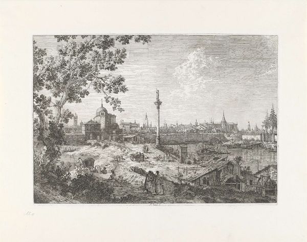 Curator: This delicate engraving before us is titled "Ruïnes op het Rapenburg te Leiden na de ramp, 1807," created by Jacob Ernst Marcus in 1807. It resides in the Rijksmuseum's collection. It’s quite striking, wouldn’t you agree? Editor: Haunting is the first word that comes to mind. There's a real rawness to it. The sky itself seems heavy, pressing down on the scene of destruction. Look at those skeletal trees—they feel like witnesses to the catastrophe. Curator: Indeed. The 'ramp' in the title refers to the Leiden gunpowder disaster of 1807. Marcus captures the aftermath on the Rapenburg canal, once a grand area, now a landscape of ruins. He was quite moved by the disaster, you see. It stirred something in him. Editor: The visual language is fascinating. Ruins, of course, carry immense symbolic weight – broken empires, faded glory, the relentless march of time. The contrast between the damaged buildings and the figures actively rebuilding... it’s a powerful tension. They're already hauling timbers! Curator: Precisely! The artist seems interested in ideas of resilience, perhaps even a spark of hope amid desolation. He frames the people engaged in mending their lives – literally rebuilding the structures. Editor: Those bare trees feel like very deliberate choices. Trees often represent life, knowledge, connection to the earth. But here, stripped bare, they seem to mirror the rawness of the human experience: loss, but also perhaps endurance, a quiet strength that will eventually bring new growth. I notice the faces in the crowd; so many in the process of reestablishing routine. Curator: You picked up on that, yes. There’s a sense of everyday life stubbornly pushing through tragedy. What resonates with me, after seeing the work for so long, is how we return. Despite devastation, our instinct is to salvage, to reconstruct. Even to start anew. The old and the new. Editor: It’s a beautifully rendered study in human fragility and the spirit that simply refuses to break. Looking at it has been really thought-provoking. Curator: For me as well, actually. The experience shows us what emerges from nothing; it leaves us pondering life itself.