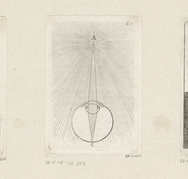 Editor: Here we have Sébastien Leclerc I’s etching, “Twee ogen kijkend naar ruit,” or “Two Eyes Looking at a Rhombus,” from 1679. It’s made with ink on paper. The composition is fascinating – almost scientific. What strikes you most about this work? Curator: What intrigues me is the *how*. Look at the labor involved in producing such a precise instructional diagram. Consider the etching process, the skilled hand meticulously incising lines into the metal plate. This wasn't just about art; it was about the democratization of knowledge through reproducible images. Who had access to these kinds of prints, and how did that shape their understanding of perspective and optics? Editor: So you're saying the process of creating the artwork gives insight into how perspective was understood and disseminated in the 17th century? Curator: Precisely. Etchings like this served a didactic purpose. It's also crucial to remember the value placed on artisanal skill, the hours spent mastering the tools. The lines themselves are material, physical imprints of intention. Are the mathematical forms presented inherently neutral or does the labor inherent in rendering them impact perception of "truth" in the demonstration? Editor: It is amazing to think of the technical mastery needed to produce such precise lines, especially given the technology of the time. I had initially considered it only for the geometrical construction it displayed, not for how it displays labor in image making. Curator: Right. Let's consider the materials themselves: the paper, the ink, and the press. These are commodities embedded within broader economic systems. Were they luxury items or widely available? How did the materiality of the print itself affect its circulation and impact? These questions broaden the horizon of understanding the work and it’s purpose. Editor: Thank you! I didn't realize how much the materiality can speak to the social environment where it was created. I will surely bring this perspective in the upcoming courses.