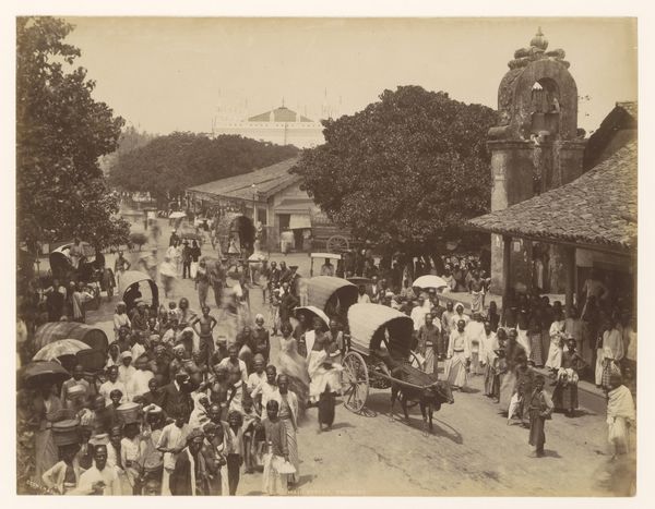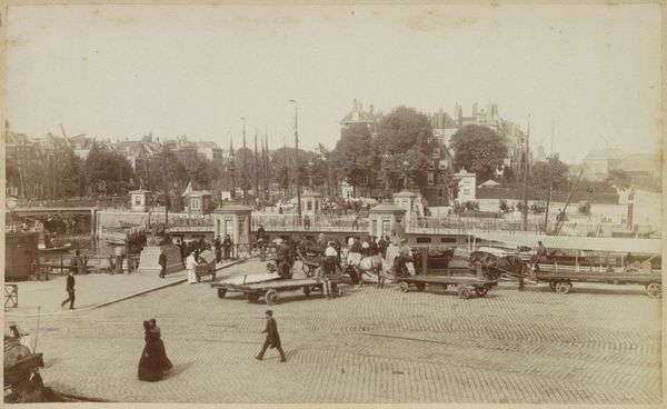 This photograph captures the Place de la Concorde in Paris, utilizing the sepia tones characteristic of early photography. The composition draws the eye into the scene with converging lines of carriages and distant monuments. The image is a study in contrasts. Note how the dense, dark masses of the trees on either side frame the open space, emphasizing the geometric layout of the square. The repetition of shapes—the roundness of the carriage wheels, the rectangular forms of the carriages themselves, and the verticality of the obelisk—create a rhythmic pattern that suggests the mechanized pulse of modern urban life. The photograph's structure invites us to consider how early photography was used not just to document reality but also to interpret and impose order onto the burgeoning chaos of the modern city. While appearing to simply record a scene, it subtly shapes our perception of Paris as a space of structured beauty. This reflects a broader discourse around the representation and experience of urban space in the 19th century.