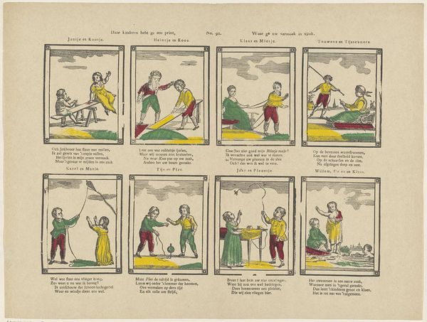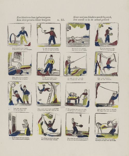 Lutkie & Cranenburg's 'Allerlei Handel' presents a grid of twelve distinct scenes, each delineated by a stark black border, creating a tableau of daily commerce. The limited palette of red, blue, and yellow, applied with flat, unmodulated tones, underscores the print’s graphic nature. These colours function less to depict reality than to symbolize various aspects of trade. Each rectangle captures a vendor engaged in their specific craft, from selling eels to apples, rendered with simplified forms that highlight essential activities. The composition’s structure—a series of self-contained units—invites a semiotic reading. It is akin to structuralist linguistics where meaning emerges not from individual elements but from their relations within a defined system. The rigid arrangement and restricted color scheme challenge traditional notions of pictorial depth and perspective. It reduces each scene to its most fundamental components. The artwork operates as a form of early information design, where each panel is a signifier within a larger cultural discourse on economy and labor. The structure of the grid, with its systematic organization of diverse commercial activities, mirrors the rationalizing impulses of a society increasingly concerned with categorization and standardization.