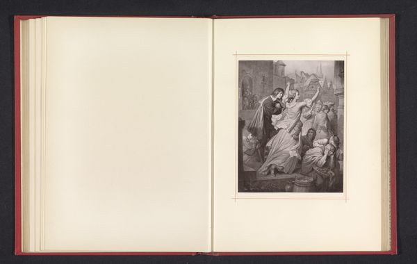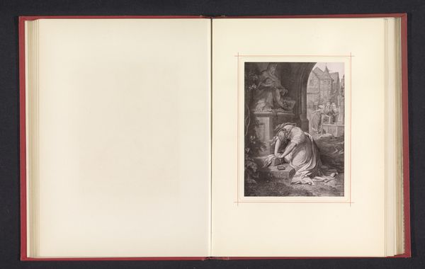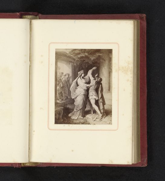 Editor: We're looking at a reproduction of a drawing titled "Orestes and Iphigenia", made before 1880 by an anonymous artist. It's a print on paper, showcased here at the Rijksmuseum. It depicts a dramatic scene, maybe a moment of confrontation, using stark contrasts. What strikes you most about this work? Curator: Immediately, it is the deployment of chiaroscuro that demands our attention. The artist utilizes light and shadow not merely to define form, but as a structuring element that dictates the emotional tenor of the piece. Note how Iphigenia, bathed in a softer light, contrasts Orestes' form, shrouded partially in darkness, creating a palpable tension. Do you observe the formal implications of this contrast? Editor: I do see that. Her face and flowing robes seem to almost radiate light, which certainly contrasts with Orestes's shadowed profile and struggling pose. It creates a focal point, directing my eyes right to her. Curator: Precisely. And consider how the composition itself is orchestrated. The receding architectural elements, the placement of the figures, all adhere to classical principles of balance and proportion, evoking a sense of order and reason. Yet, simultaneously, the emotional intensity conveyed through gesture and expression disrupts this classical equilibrium, creating a fascinating formal dialectic. How might one describe the lines that make up their figures and clothes? Editor: The lines seem quite precise, almost rigid in places. They give a sense of solidity to the figures, as if they’re carved from stone. Perhaps mirroring their immobility, how neither one wants to move or perhaps are literally stuck in that pose. Curator: Indeed. The deliberate articulation of line contributes to the overall impression of a constructed reality, where emotions are carefully mediated through artistic conventions. It allows us to decode a structured image. A fascinating demonstration of form shaping our emotional reading of the scene. Editor: Thank you, I’ve definitely noticed much more this time around! Curator: I, too, have refined my focus regarding how seemingly static compositions can engender emotive discourse.