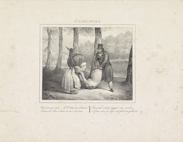 Jean-Louis Van Hemelryck created this print, "Koning Willem I sprekend met een man in het park", in 1829. The artwork is a study in contrasts, composed of meticulous lines and monochromatic tones that shape the scene’s spatial dynamics. The subjects are arranged to guide the viewer's eye. Here, form follows a narrative function. Willem I, with his confidant on a bench, contrasts sharply with the figure receding into the depth of the park. The composition thus becomes a signifier of power and intimacy versus distance and exclusion. We can thus see how Van Hemelryck employs space to suggest social and political relationships. The piece reflects a semiotic encoding of status and interpersonal dynamics. By studying the image’s formal elements we can decode its cultural and philosophical concerns. In essence, this print goes beyond a mere depiction of a historical encounter. It invites us to consider how constructed environments and formal arrangements contribute to the language of power and social hierarchy.