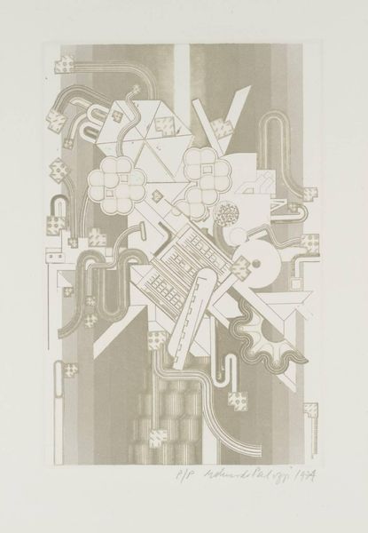 Curator: What a fascinating piece. This is "Ciao Picasso" by Sir Eduardo Paolozzi. Editor: It's certainly busy! My first thought is that it feels almost like a deconstructed machine, a celebration of mechanical forms in soft colors. Curator: Paolozzi, of course, was deeply engaged with post-war culture and the rise of technology. He was interested in how mass production and media influenced society. Editor: Absolutely. The title, "Ciao Picasso," suggests a playful farewell to traditional art forms, perhaps embracing the mechanical and the modern. You can really situate Paolozzi at the intersection of art, technology, and social change. Curator: It's difficult to ignore the presence of machinery motifs here. Editor: Yes, the mechanical forms suggest a fascination with technology. But the use of pastel colors softens the industrial feel, creating a strange tension. Curator: Indeed. Paolozzi uses this piece to almost comment on our post-war relationship with machine-age technologies. Editor: This has really highlighted the shift in artistic perspectives! Curator: For me as well! I find it thought-provoking.