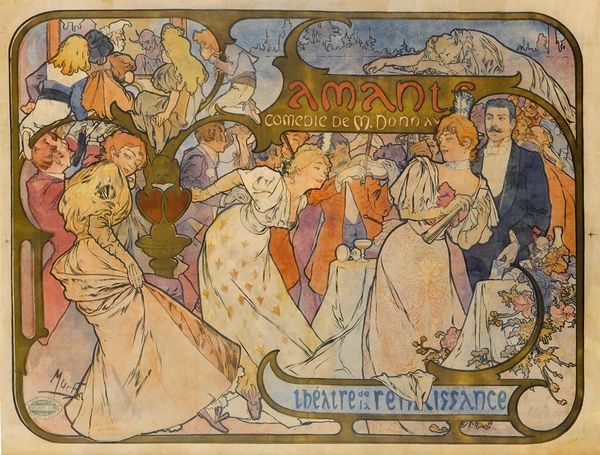 Curator: This piece is Alphonse Mucha’s poster for "Amants," a comedy by Maurice Donnay, dating from 1895. Look at that gorgeous watercolor! What's your take? Editor: What strikes me immediately is the stylized chaos contained within that elegant frame. It feels like peering into a gilded dream of a bygone Parisian party, with an undercurrent of playful eroticism. Curator: Definitely! Mucha's poster work is all about that beautiful, decorative containment. Notice the central couple—they almost seem lifted from the surrounding whirl. Symbolically, what do you make of their positioning in front of the swirling partygoers in the backdrop? Editor: Well, in iconography, centrality always indicates importance, right? They are presented to us—spotlit, even— as the main actors, frozen momentarily in an artful tableau before melting into that beautiful crowd. But it feels like the "Amants" could be anyone, with an expression neutral to the general festivity that is taking place, or maybe even overwhelmed by the very act of social gathering itself. Curator: It's interesting you bring that up. It feels deliberate. Maybe he’s underscoring that this drama of lovers, the subject of Donnay's play, is always unfolding around us. We’re all actors in each other’s dramas, right? Notice too how he interweaves the typography, the words "Amants" and "Theatre de la Renaissance" becomes just another flowing decorative element of that gilded framing of people celebrating. Editor: That melding of text and image does create that flowing movement! Even in this compressed stage backdrop of bodies, and fabrics there are so few hard angles or static points, all these small elements combine to become a powerful visual symbol for festivity itself. This work, much like a modern-day movie poster or advertisement relies less on artistic detail, and more on symbolic gestures meant to captivate our attention. Curator: True! It has an irresistible exuberance! The overall feel is festive—the anticipation and romantic feeling of theater-going! Editor: So the enduring fascination with this piece may well stem from our continuous fascination with love and festivities; we, after all, crave both. Curator: A wonderful point to end on! It’s been a pleasure diving into this Mucha masterpiece. Editor: Absolutely, it was a fascinating exploration of artistry and symbol!