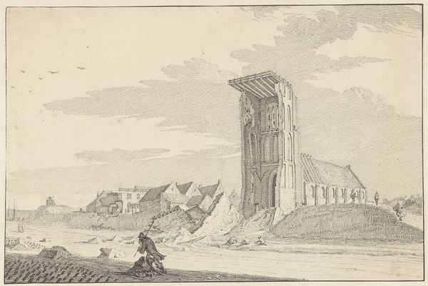 Editor: This pencil sketch, "Grafmonument van Theron vlakbij Porta Aurea buiten de muren van oude Agrigento," made by Louis Mayer in 1778, has such a lonely feeling to it. The monument looms over these tiny figures. How do you interpret this work? Curator: The monument itself is heavy with cultural memory, a silent sentinel marking time and transition. The artist, working during a period of renewed interest in classical antiquity, used this architectural symbol to reflect on power, death, and legacy, especially with those Neoclassical ideals. It is a symbol of both personal and civic pride, a stage for the theater of memory. How do you see the relationship between nature and architecture expressed here? Editor: Well, the landscape feels quite raw, almost untamed. It makes the monument feel even more stark and isolated. It’s as if nature is indifferent to this human attempt at permanence. Curator: Precisely. Notice how the lines create a texture for not just the trees, but for the monument itself. Consider the human figures juxtaposed with its mass: tiny actors set against this edifice. Do they diminish or amplify the weight of this stone record? Editor: They definitely amplify it. It highlights the contrast between something meant to last forever, and the ephemeral nature of human life. Curator: Indeed. The figures serve as witnesses across time. A physical reminder of the human scale within a landscape and architectural construction of a lasting empire. Editor: I see it now. I had only thought about its loneliness but you helped me see the historical and cultural layers within those symbols. Curator: Every mark carries weight. Today’s monuments create tomorrow's symbols and memories.