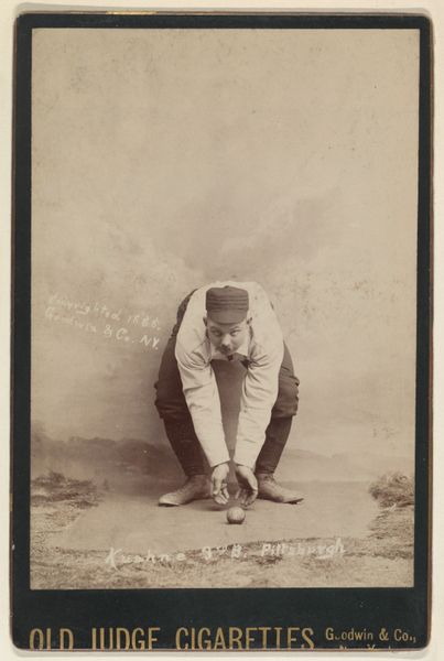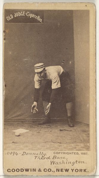 This baseball card of Tommy McCarthy, a second baseman for Philadelphia, was produced around 1887 by Goodwin & Company for Old Judge Cigarettes. It's made from a thin sheet of paper, likely mass-produced, with a photograph adhered to the front. The sepia tone suggests a photographic process like albumen or gelatin silver printing, common at the time for their reproducibility. The image itself captures McCarthy in action, reflecting the growing popularity of baseball and the emerging culture of celebrity athletes. But this card is also a product of its time, a piece of commercial ephemera designed to be collected and traded. These cards were included in cigarette packs as a marketing gimmick. It's a reminder of the close relationship between consumer culture and leisure activities. Ultimately, it's a small but fascinating artifact that speaks volumes about the intersection of sports, industry, and popular culture in late 19th-century America.