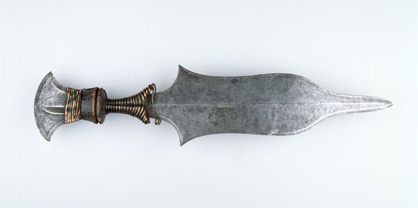This ceremonial arrowhead, or "yanone", was crafted by Umetada Yoshinobu, sometime between 1601 and 1700. It's wrought from iron, an industrial material transformed into a symbol of status. The arrowhead's form is striking. The metalwork is delicate, with openwork that frames a figure of Fudo Myoo, a Buddhist deity associated with protection. Note the contrast: a weapon of war rendered with the precision of a jeweler. It’s this very tension that gives the object its power. Yoshinobu was not just a blacksmith, but a highly skilled artist, working within traditions of metalworking and design. Pieces like this, made for the elite, blur the lines between craft and fine art. The labor involved in creating such an intricate piece speaks to the hierarchies of the time. It reminds us that even the simplest materials can be elevated through skillful making and imbued with cultural significance.