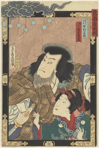 This is "Print," an early 19th-century woodblock print by Yashima Gakutei, now housed at the Metropolitan Museum of Art. The composition is dominated by two figures in contrasting poses: a standing archer with a drawn bow, and a kneeling figure with outstretched hands. Notice how the archer's diagonal bow bisects the picture plane, creating a dynamic tension. This is further emphasized by the geometric patterns of their clothing, which juxtapose against the naturalistic rendering of the landscape behind them. The use of color is subdued, with earthy tones of red and green dominating the palette, imbuing the image with a sense of historical narrative. This echoes traditional Japanese aesthetics while subtly challenging fixed perspectives through its unconventional framing and character portrayal. Gakutei destabilizes traditional Japanese art by integrating elements of human expression within codified visual language.