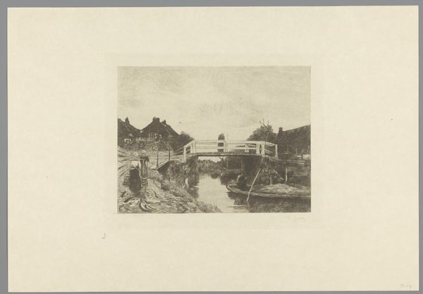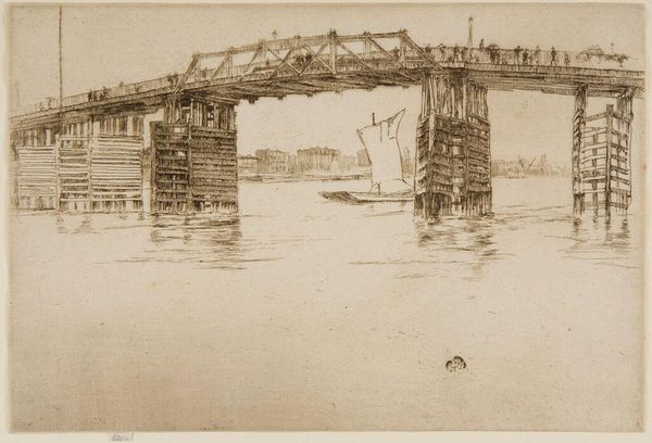 Curator: The stark simplicity of this sketch is captivating. Gerard ter Borch, around 1634, captured this "Sluis in een rivier"—a lock on a river—using ink on paper. Editor: There's a certain melancholic quality, isn’t there? The muted tones and rather still water…it feels very contained, even slightly oppressive. Curator: Indeed. Locks like this, while functional for trade and transportation, often became symbols of control—attempts to manage and tame the natural world. Borch, during the Dutch Golden Age, was likely commenting on the delicate balance between human intervention and nature's course. Editor: I see it, though I would argue he's highlighting human dependence on these structures. A sluice, in this region, would control flood, thus preserving lives and ways of life. Is it too much of a leap to connect that control to power and security within Dutch society? The drawing’s sparseness almost lends it the air of a political statement, of survival itself. Curator: Not a leap at all! The repeating sluice openings could suggest many successive societal strata depending on river water to maintain existence. Furthermore, notice how he places the viewer low, near the water. We're drawn into this sense of dependence, physically almost submerged within it. Editor: Which returns to the melancholic mood—the vulnerability this highlights! We feel so near and dependent on its mercy. Beyond that, how do you interpret the stark, almost severe lines of the architectural structure versus the softness of the water? Does that signify anything symbolic to you? Curator: It speaks to a dichotomy. Perhaps he's showcasing how society’s progress depends on restraining forces, but at a great cost. One is hard edged—linear, man-made—while the other reflects nature in her true chaotic, flowing form. I would say Borch captured much about humanity's place here. Editor: This little sketch becomes incredibly profound the more you sit with it. Thanks for taking the time. Curator: Absolutely. Considering it closely certainly amplifies both its social impact and emotional power.