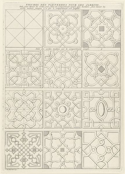 Curator: Let's turn our attention to Alexandre Eugène Prignot's "Vlakvulling van friezen en vierkanten," a drawing created sometime between 1832 and 1875. The intricate, repeating patterns evoke a sense of ornate elegance. Editor: Elegance yes, but it also feels incredibly systematic, almost mass-producible. Look at how the repeated square motifs create the feel of tile samples in a factory catalog. It speaks to the industrial impulse taking root at the time. Curator: Precisely! Note how each square employs different symmetrical arrangements—radial, bilateral—creating internal dialogues within the larger structure. The use of positive and negative space articulates each pattern distinctively. Editor: I find myself wondering about the craftspeople, though—the hands that would be translating this drawing into material form, perhaps inlaying wood or setting stone. This isn’t just an aesthetic exercise, it’s instructions, labor waiting to happen. How would the artist view the labour to produce the patterns? Curator: An excellent point. Consider, also, how the bordering details enhance each shape. The choice of simple lines, geometric motifs, and stylized flora reinforces the tension between organic and constructed forms, fundamental elements to structural design. The patterns within the grid frame invite our eyes toward multiple interpretations, and challenge us with questions of depth and surface, harmony and complexity. Editor: I am less drawn to that visual complexity, and instead feel curious about the raw materials. It would be interesting to analyze if it was for architectural decoration, as a cheaper substitute for crafted and material richness? We see here the dawn of mechanically-produced ornament, a new chapter of creative industries. Curator: I agree there is much we could unpack here. Prignot’s exploration of the modular system, invites us to reframe our very understanding of art making. Editor: Absolutely, I'm walking away intrigued to contemplate these shifting notions about material, craft, and production during this time.
