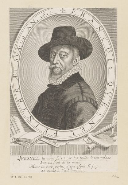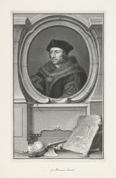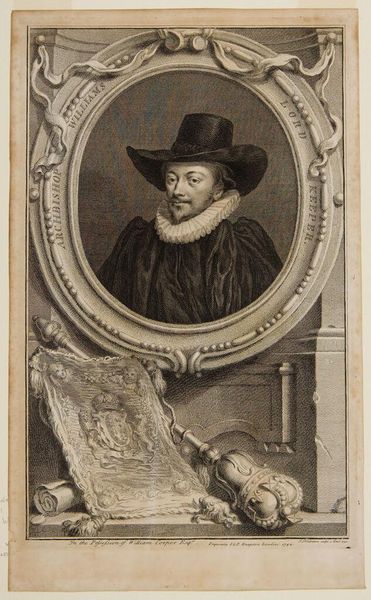 Curator: Before us, we have "Portret van John Williams," an engraving by Jacob Houbraken, dating back to 1742. It resides here at the Rijksmuseum. Editor: My initial reaction is one of formality. The composition is rigidly structured, yet there is something serene about the tonality, rendered through the medium of engraving. It looks clean. Curator: It's a wonderful example of Baroque portraiture in print. The intricate details—look at the layers of meticulously etched lines used to model forms! It reflects Houbraken's mastery. I notice the frame enclosing Williams' likeness; the artist's attention to detail seems to know no bounds. Editor: Frames within frames always point to something! Note how the frame is adorned with sculpted motifs, classical flourishes. And then the paraphernalia beneath – what is the symbolism at play there? What statement is being made about Williams? I wonder if it implies a regal quality? Curator: Yes! That crest might offer insight into his lineage, which has a narrative all its own. And there seems to be an echo of his power – perhaps temporal – conveyed in the heavy drapery with its suggestive royal accouterments. However, returning to form, the balance created with the oval portrait offset by these elements below makes for such interesting tension. The curve of the frame echoes in the draped elements. Editor: Agreed, the visual rhymes give structure but let's dwell for a moment on the man. He is styled to denote authority, that’s sure, but look at the soft rendering of his face—almost as if softened through memory and captured via nostalgia. It lends such human presence to all the pomp surrounding it. Curator: Yes, precisely that layering of line serves both structural integrity and allows such fine gradations. Ultimately creating balance to soften rigid structure! Thank you. Editor: The balance gives so much to ponder over – it's about public image, sure, but the print implies an undeniable humanness. The man almost defies his rank by being so palpable!