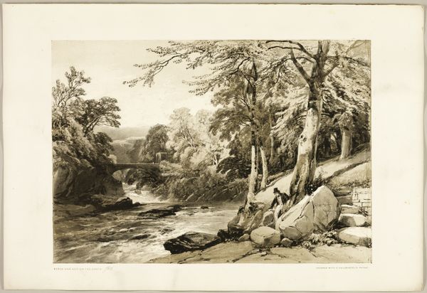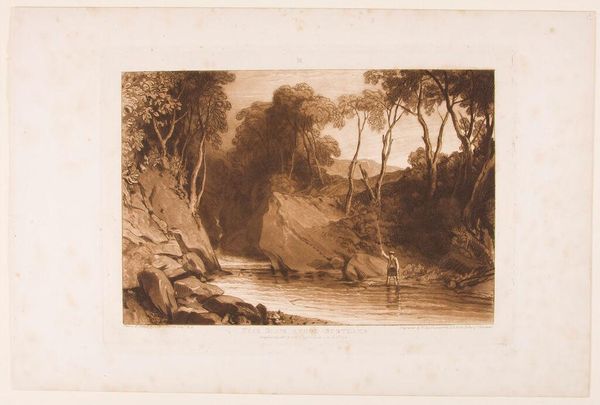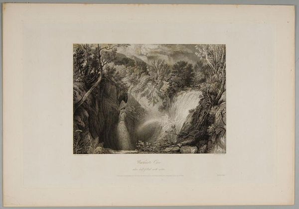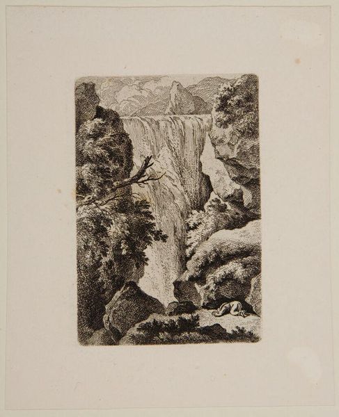 Curator: Johann Caspar Nepomuk Scheuren, born in 1810, created this etching, titled Plate IX, now residing in the Harvard Art Museums. Editor: My first impression is of a somewhat melancholic scene, despite the rushing water. The stark blacks and whites create a feeling of isolation. Curator: Note the interplay of light and shadow, how it carves the space. The diagonal lines leading the eye upward, mimicking the mountains, invite contemplation, connecting earth and sky. Water, of course, is a potent symbol of purification. Editor: Yes, and the density of the line work varies greatly; from the light airy strokes in the sky to the dense thickets surrounding the water—which creates a beautiful contrast. Curator: It speaks to a deep Romantic yearning for a connection with nature, a reflection of the soul’s journey through the wilderness of life. Editor: Indeed, the composition almost feels like a stage set, heightening the dramatic feel. Curator: The enduring power of symbols. Editor: Absolutely, a masterful use of technique.