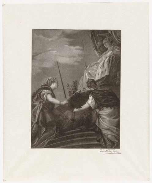 This is Timothy Cole's "Delphian Sibyl", made sometime between the late 19th and early 20th century. The artwork is an engraving, where the design is cut into a metal plate, inked, and then printed onto paper. The real artistry here lies in Cole's mastery of the engraving process. Notice the fine lines and delicate shading that give the figure depth and volume. Engraving is labor-intensive, demanding precision and control. Cole has skillfully translated the qualities of the original painting into a new medium, showcasing his technical prowess and understanding of light and shadow. The process transforms the source material into a printed image, making it accessible to a wider audience. The act of engraving, with its meticulous handwork, elevates the print beyond mere reproduction. It becomes a testament to the value of skilled craftsmanship in an age increasingly dominated by mechanical reproduction.