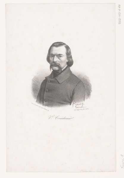 Curator: The artwork before us is Alphonse Farcy's 1848 portrait of Pierre Leroux. Editor: It's immediately striking—the subdued quality. The hatching and cross-hatching of the pencil work give a real sense of depth, though restrained, almost melancholic. Curator: Yes, and Leroux was quite the figure during that time. He was a philosopher and political economist, advocating for a form of utopian socialism that became rather influential. This portrait captures him during a period of intense social and political upheaval in France. Editor: You can see that reflected in the sitter’s gaze—direct, but not confrontational. There’s a certain softness achieved through the medium itself. Pencil, in contrast to, say, oil paint, lends itself to a kind of quiet intimacy. Curator: Exactly! Farcy produced this around the time of the 1848 Revolution, so, there’s that fascinating interplay between Leroux's progressive ideas and Farcy’s artistic representation. It makes one wonder how Farcy's own political views informed the portrayal. Editor: Notice, too, how the artist focuses on the face, creating depth in the eyes and mouth, simplifying the rest. The collar and jacket are rendered with broad strokes, which emphasizes Leroux's presence without excessive detail. It draws attention to the face without clutter. Curator: And it's likely this piece was circulated through lithographs at the time, furthering Leroux's image. Print culture was how many of these thinkers reached wider audiences. This portrait thus serves not only as an artistic endeavor, but also a historical document. Editor: A rather elegant document. The subtle use of shading is superb. And, of course, the simple fact it is black and white offers an interesting exercise in stripping away the unnecessary. Curator: Thinking about it all now, the piece tells us a lot about how influential thinkers were visualized and presented within the broader social context of 19th-century France. Editor: Indeed, a simple yet quietly powerful exploration of form. Thank you for the illuminating social and historical details; they truly add layers to what I initially saw as just elegant simplicity.