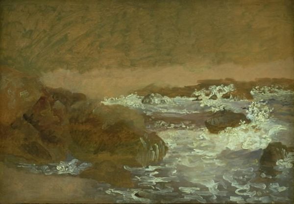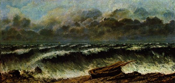 Editor: So, this is Courbet's "The Wave", an oil painting; it looks incredibly dramatic, almost ominous. The sky is heavy, and the sea seems powerful, even angry. What symbols jump out to you in this piece? Curator: The wave itself. Think of the symbolic weight of the sea across cultures: primal, untamed, a space of both life and death. Courbet captures that duality. Notice the small sailboat on the horizon; what does it mean in the context of the vast, overpowering wave? Editor: Maybe it represents human vulnerability against nature's force? Like, a David versus Goliath, but nature's the Goliath? Curator: Precisely! It evokes a sense of insignificance. Consider, too, the Romantic obsession with the sublime - that overwhelming feeling of awe mixed with terror. The wave, in its sheer immensity, triggers that response. But does Courbet offer solace, a way to overcome the feeling? Or simply leave the viewer to contemplate the grandeur? Editor: I see your point! He does seem to hold back from giving easy answers. Maybe that is a symbol of his Realist project? I had initially read the image as totally pessimistic. Curator: And did your thoughts evolve by reconsidering the sailboat and the context of Romanticism? Remember how art movements influenced one another! Editor: Absolutely, thinking about those aspects changed my understanding quite a bit! I initially responded to the pure drama of it all. Curator: That's how we understand images! Symbols speak through emotions, stirring our memories of experiences or cultural memory. "The Wave" becomes more than just an ocean view. Editor: Thank you! I'll never see seascapes the same way!