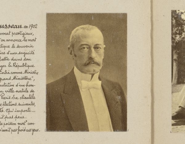 Curator: This is a gelatin silver print titled "Portret van Henri Trotta" created sometime between 1900 and 1920 by the photography studio of Delboy & Baer. What do you make of this, visually? Editor: A chap who takes himself rather seriously, I'd wager! The precision of that mustache! There's a stiff formality to it, a holding-of-the-breath quality, yet softened by the very evident humanity in his eyes. He feels immediately present, yet… far away. Curator: That perceived distance makes sense when considered within the conventions of early 20th century portrait photography. Posing was carefully orchestrated to convey dignity and status, part of a larger project in constructing and solidifying social identities. Editor: Yes, a public self very much on display. It does make you wonder about the unseen, the Henri Trotta who wasn’t trying to be Henri Trotta of Noteworthy Importance. Though, thinking about it, is "Realism" a loaded descriptor here, or any photographic portrait? I mean, is photography even able to really offer pure objectivity? Curator: "Realism," as applied to early photography, often masks a deliberate engagement with aesthetics. The arrangement, the lighting, and the choices made in the darkroom demonstrate artistry beyond mere replication of reality. Also, early modernist aesthetics involved an understanding of the psychological implications of these artistic choices for viewers. Editor: Which takes me back to those eyes. The way that the single lens rests gives it a little cheeky slant, you know? It undermines the strict composition a bit! There's also the oddest sensation of intimacy, of somehow getting closer to him by just seeing him a bit more than he wanted to reveal. It's as if the image hints at stories beneath the surface, like rings hidden within an old tree's age. Curator: And that, in many ways, encapsulates photography's evolving role within a quickly modernizing world—capturing moments, creating enduring symbols, and negotiating between how we see ourselves, and how we want to be seen. Editor: I'm struck how those formal portraits still ripple outwards across time, even now allowing us that oddly touching access into another person's life. Thanks for sharing that view.