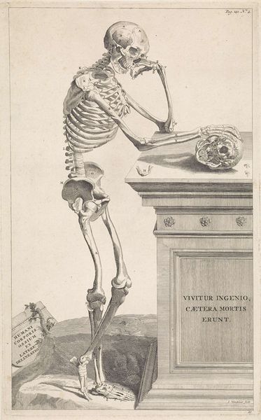 Jan Wandelaar created this print called *Landschap met skelet*, or Landscape with Skeleton, in the 18th century. During this period, the human body increasingly became a subject of scientific scrutiny and artistic representation. Wandelaar was working in a time of shifting cultural attitudes toward death and the body. Medical science was starting to take off, but the aesthetics of death were also evolving, and the body was regarded with a mixture of scientific interest and existential contemplation. This work depicts a skeleton in a melancholic pose, set within a barren landscape. Instead of a triumphant, upright stance, we find a being caught in a moment of reflection or despair. This representation develops an alternative narrative by departing from traditional triumphant depictions of death. Wandelaar seems to invite us to meditate on our mortality. He presents the viewer with an emotional and intellectual conundrum, as he uses scientific illustration to ask, what does it mean to be human? The visual juxtaposition creates a profound meditation on life, death, and the human condition.