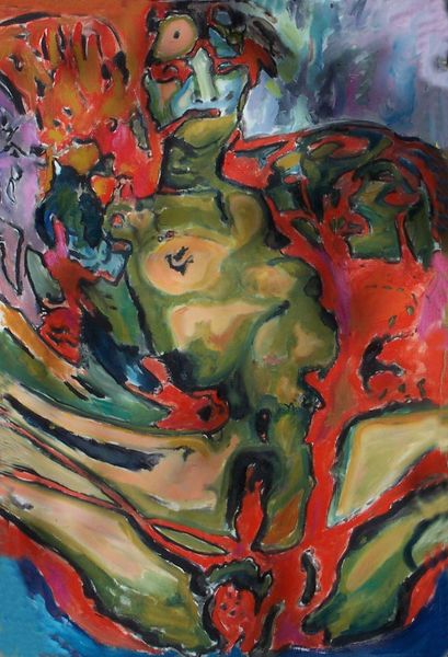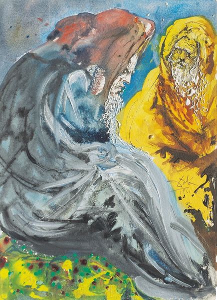 Curator: Here we have what appears to be Filipp Malyavin's "Dancing Peasant Woman In A Colourful Shawl." It is an oil-on-canvas painting reminiscent of genre paintings infused with Fauvist colors. What’s your take on it? Editor: Energy. It feels utterly brimming with a joy that practically vibrates off the canvas. Like sunshine after a storm, even the darker hues feel alive! Curator: Yes, there is something incredibly lively here. Consider the composition: it’s almost haphazard, certainly not concerned with strict realism. But that adds to its emotional strength, don't you agree? The figure seems on the brink of ecstatic movement, enhanced by this sense of freedom. Editor: Exactly! I love the way Malyavin just explodes with colour – that bold shawl juxtaposed against the blues and greens! There’s such a delightful tension between form and fluidity. Do you think it’s the lack of strong lines? Curator: Absolutely. The visible brushstrokes—especially on the background—contribute to a sense of immediacy, as though the painting was executed in a flurry of creative passion, prioritizing emotion above all else. In some lights, the acrylic reads like soft chalk pastel work Editor: She almost seems suspended in a dream, doesn’t she? Arms outstretched. The background could be anything...forest, dreamscape, memory! She is inviting you into her own internal world of feeling. Curator: I’d wager the lack of rigid contextual anchors actually works in Malyavin’s favour, placing us smack-dab inside the dancing woman’s lived emotion. A bold use of semi-abstract gesture paired with an Expressionist flair… the figure and background almost breathe together. Editor: The figure has real dynamism; such immediacy conveyed via Malyavin’s approach. You are so right—there’s real breathing room in it. Curator: Indeed, its strength rests on the idea that less is more. To conclude, "Dancing Peasant Woman In A Colourful Shawl” evokes a real feeling—it pulls us viscerally, perhaps due to Malyavin not spelling everything out and challenging our assumptions of artistic interpretation. Editor: A fine point—I love a painting that leaves some room for interpretation and reflection. It has a certain raw energy about it. You feel the artist’s presence almost like you were sitting right beside Malyavin in the fields watching. A triumph, wouldn’t you agree?