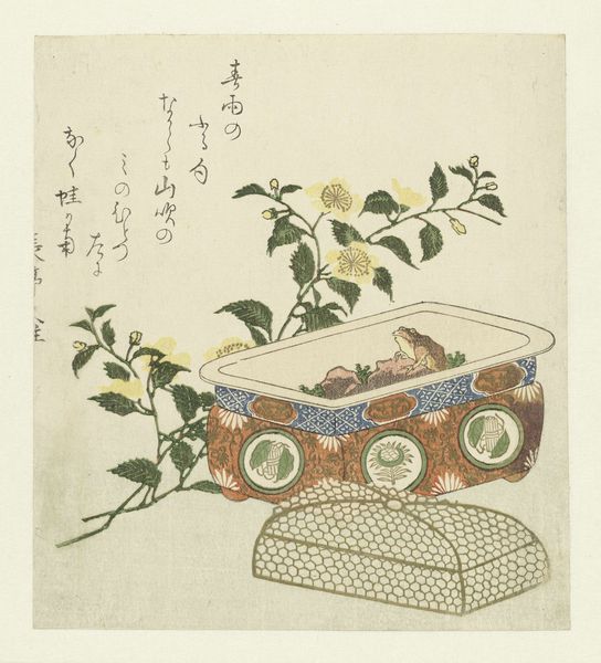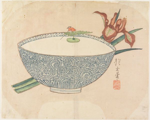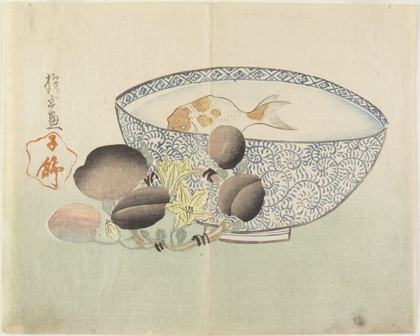 This print by Shozo Ittei depicts a porcelain bowl and scissors in muted colours, creating a still life that feels both intimate and somewhat detached. The bowl, rendered with careful attention to its patterned surface, dominates the composition with its round form. Notice how the bowl is decorated with geometric patterns, a design choice which can be seen as a semiotic device pointing to the artist's cultural roots. The scissors placed beneath the bowl add an element of human scale, subtly destabilizing the sense of harmony. The formal structure, with its blend of organic and geometric elements, can be viewed through the lens of structuralism. The textual elements scattered throughout the composition, in the form of calligraphy, further enrich the visual field. These marks challenge a purely visual interpretation, pushing the viewer to decipher the underlying codes and meanings. This interplay between text and image functions on both an aesthetic and intellectual level, prompting a re-evaluation of the relationship between seeing and reading.