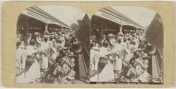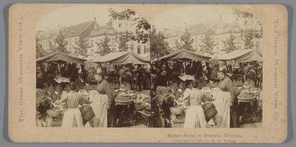 Curator: What a find! This is a gelatin-silver print, a photograph titled "Gezicht op de Appelmarkt in Amsterdam," placing us sometime between 1850 and 1900. Attributed to the studio of Gebr. van R. Editor: My first thought? Hazy. The sepia tones feel like looking into a half-forgotten dream. So many faces staring back across the years, it's more haunting than heartwarming. Curator: I can see that. It's a window into the past, quite literally, capturing daily life on the Apple Market in Amsterdam. The formal repetition of the market stalls creates a structured rhythm, anchoring the lively genre scene. See how each structure is slightly unique with different vendor gatherings, almost like portrait vignettes? Editor: You're right, there's a narrative in each little huddle! Though technically impressive for its time, I keep drifting back to the individuals. Look at the children! Their direct gaze breaks the distance, pulls me into their moment. What do you make of their clothing? Curator: The details in their garments are incredibly telling, particularly given the limitations of early photography. Clothing reflects a stark societal divide, capturing a moment suspended between aspiration and reality within this market hub. Compositionally, that cobblestone street converging toward the background is wonderful, it gives a clear sense of perspective. Editor: And that lone lamppost standing watch! I wonder if the photographer was aiming for a sort of documentary realism, just capturing life as it was without any frills? Curator: It presents as a very unvarnished record. In capturing the architecture and activity of the market so seamlessly, and using the people to create such a feeling of candidness. it’s almost hyperreal. But there are obviously formal choices involved with the setup of a landscape photo, with that incredible tonal range from the dark foreground all the way into the sky. Editor: This image almost acts like a stage play in photographic form. Its haunting atmosphere is definitely due to that sharp contrast and those sepia tones. I feel transported. Curator: For me, it’s a beautiful artifact – showing daily life caught in a structured dance. Thank you for sharing this with me!
