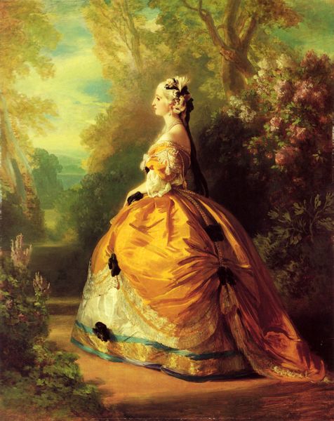 Curator: What strikes me most is the shimmering surface quality in this portrait of Grand Duchess Alexandra Nikolaievna. Editor: Indeed, the texture is remarkable. There’s a visual sumptuousness achieved through what appears to be a delicate handling of oil paint. I see this material presence inflected with social and historical meaning, the excess and expense made visible through layers of labor and commodity exchange. Curator: Certainly. The artist, Christina Robertson, portrays the Grand Duchess against the backdrop of a classical arch, hinting at both tradition and the social constraints placed upon women of her rank. Editor: Look at how the sheen on that pink fabric nearly vibrates. It’s a celebration of wealth manifested in the skillful application of a single material – oil paint to canvas. But also the origin of the fabric as the material base and product of human labour, we need to examine. The social implications can hardly be overlooked, can they? Curator: Precisely. The composition directs our attention not just to the finery of her dress, but to Alexandra’s self-presentation, negotiating identity within those very limitations of courtly expectation, a double bind for many aristocratic women then. There's also this attempt to read herself against nature as presented behind her in an almost idyllic image which adds a certain nuance to her characterisation in terms of what options are given or removed. Editor: It’s an impressive control of the medium—Robertson really demonstrates proficiency through this glossy gown. To have produced fabric with such tactile opulence would’ve taken an extraordinary labour. Do you think there’s a subtle critique implied, a knowing commentary through this meticulous presentation? Curator: A potent question. This representation may very well carry within it both admiration for and a critique of social structures that demanded such performative displays of wealth. Ultimately it depends on the subjectivity, background, and beliefs of each member involved from production all the way until display: author, artist, and subject. The book laying slightly open to her side invites a view of her not as just a political being but someone also able to develop an intellect; while in tension to the submissive way the painter represents her. The question of how it functions in this Hermitage Museum today also remains in consideration, if we approach the picture in this way. Editor: Thank you. I will not see this work of romanticism as something 'self-evident' anymore, this piece now holds a multiplicity and complexity for me I previously would have missed. Curator: Glad to be of service. It has made for a more intriguing analysis for myself as well!