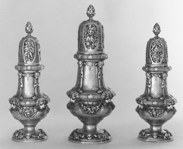 Paul de Lamerie crafted these cruets and their stands in the 18th century from silver and glass. The forms are decidedly extravagant, marked by intricate ornamentation. Notice how the reflective surfaces of the silver amplify the complex details, creating a dazzling visual effect. De Lamerie's design showcases the stylistic principles of the Rococo period. The symmetry in the pairing is offset by the fluid lines and asymmetrical patterns of the applied decoration. These elements destabilize the more rigid structures typical of earlier styles. The curvaceous forms and naturalistic motifs, like shells and foliage, evoke a sense of organic growth. This stands in contrast to the highly controlled craft of silversmithing. Consider how these cruets exemplify a cultural shift towards valuing ornate detail and dynamic form. This preference suggests a move away from classical restraint towards a celebration of opulence and sensory richness. These aren't merely functional objects, but elaborate displays of wealth and taste.