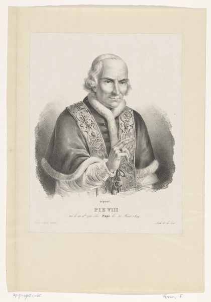 Curator: This drawing by Alphonse Farcy, completed in 1849, is entitled “Portret van kardinaal Hugues de La Tour d'Auvergne-Lauraguais." It's a pencil drawing, showcasing the Cardinal in detail. Editor: It strikes me as a portrait of profound stillness. The achromatic palette only adds to the mood. Look how the figure emerges from the pale background, as though being revealed from shadow. Curator: Notice how Farcy uses the pencil medium to create variations in tone and texture. The shading around the Cardinal's face gives depth, and the way the light reflects off his sleeves gives them a certain volume. The carefully etched lines create the overall form, providing us with insight to his material. Editor: Indeed. I think its creation is tied directly to the Cardinal himself. It's easy to consider the role the Church would play during this period, particularly with shifts in French society and governance post revolution, but also his role. His expression is hard to read. Is he thoughtful or reserved? Is he contemplative of the power that he weilds? Curator: Consider also the symbolism implied within. His clerical collar and the prominent crucifix mark his devotion. However, he holds an envelope or letter that may indicate earthly obligations, such as communication and earthly responsibilities. The picture is not only about religion but perhaps about the confluence of both sacred and profane responsibilities. Editor: I think these formal choices mirror the broader shifts in society. Portraiture, even religious portraiture, took on a very real social power, as artists documented figures of authority but also opened a space for critiques, endorsements, or conversations of authority. Curator: What I appreciate is how the interplay of technique and tone results in a cohesive artwork. In the meticulous rendering of detail—consider the lace at his cuffs. The medium of pencil makes his robes seem all the more real, giving the viewer insight into the world of the sitter. Editor: And it is those kinds of insights—the dialogue that pieces like this start—that remind us how art is inseparable from its time, forever reflecting on those values and questions. Curator: Exactly. And the skill and perspective in this pencil drawing creates a lasting, quiet impact on its viewers, encouraging conversation about meaning, power, and mortality.