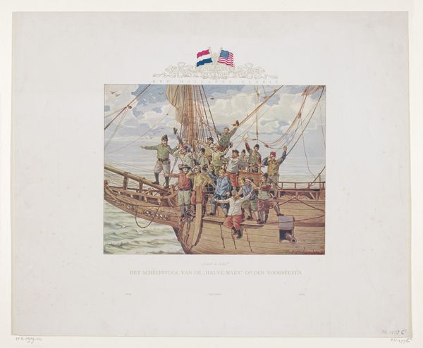 This lithograph depicts a scene of cultural exchange between a European vessel and Japanese dignitaries. Though anonymous, this image speaks volumes about the politics of representation during a period of intense globalization. The work likely comes from the mid-19th century, a time when European powers were aggressively expanding their influence, particularly in Asia. The print subtly portrays the dynamic between colonizer and colonized. The clear depiction of the European ship, contrasted with the more generalized depiction of the Japanese delegation, suggests a claim to technological and cultural dominance. Consider the conventions of maritime painting, which were often used to project power and prestige. This work echoes those traditions while also hinting at the complex negotiations and cultural encounters that defined the era. To fully understand this image, we might consult historical records of diplomatic missions, accounts of cross-cultural encounters, and studies of the visual culture of colonialism. Only then can we appreciate how this artwork reflects the social conditions of its time.