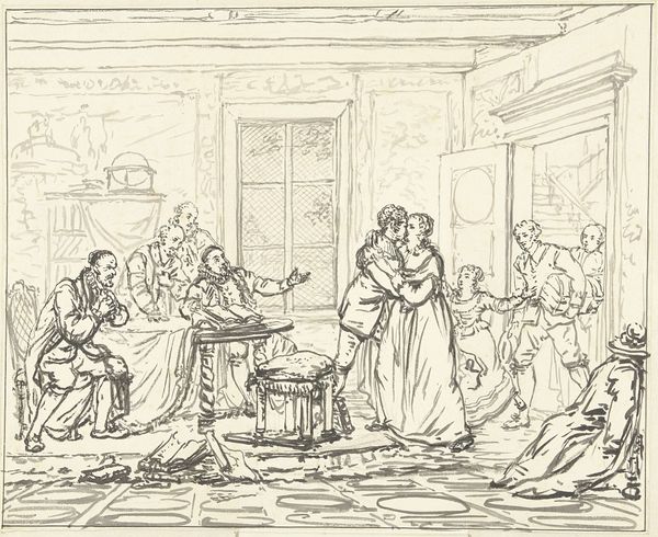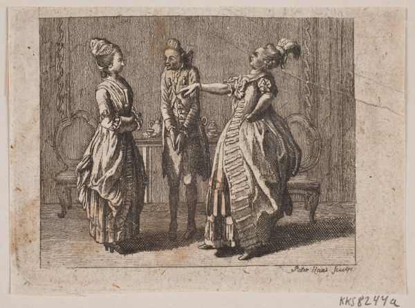 Editor: So here we have "A Drawing Room Altercation, an illustration from Tobias Smollett's 'The Expedition of Humphry Clinker'", made in 1793 by Charles Grignion, I. It’s an ink engraving. It feels like a theatrical scene – lots of drama packed into one little drawing. What strikes you when you look at this, especially considering it's illustrating a novel? Curator: Oh, my dear, it's a riot, isn’t it? Look at those faces – positively operatic! Grignion's captured a delicious little storm in a teacup, or rather, a drawing-room. I see a battle of wills, generations clashing like cymbals. Tell me, what do you make of the figure lurking in the doorway? Does that voyeuristic touch change your reading? Editor: I almost missed him! Now, I see a secret being observed, making me think of how conflicts are rarely as simple as they appear on the surface. This man makes the conflict even more like theatre with an audience. Are the other figures on stage, in a way? Curator: Precisely! Perhaps Grignion suggests that societal expectations, even private disputes, were always performances. This image gives me that cozy feeling of Romanticism that I would enjoy hanging at home! The Romanticism that holds humor, a good story, and perhaps a hint of satirical delight. Do you get that same feeling? Editor: Definitely, the detail almost demands a second or third look to unpack the narrative. Curator: Ah, exactly! Each little line seems to vibrate with its own miniature drama. A delightful dance of observation and speculation. I can now confidently say I am also quite in love with this artwork. Editor: I love how a simple illustration can hold such a complex story. Thanks for unlocking it for me. Curator: The pleasure was all mine, my friend! It's pieces like these that remind us art is everywhere and can hold magic and complexity even in very old creations!