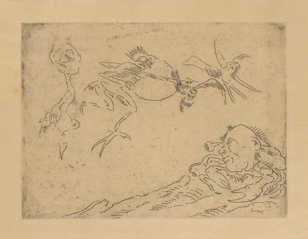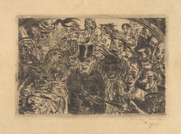 James Ensor made this etching depicting "Christ's Descent into Hell." The composition is a teeming array of figures, rendered with fine lines and intricate details, evoking a sense of chaotic energy. At the center stands Christ, an elongated figure, dominating the scene despite being surrounded by grotesque and masked faces. The use of etching allows for a textural contrast, setting the ethereal against the grotesque. This relates to structuralist ideas about binary oppositions, with Ensor using visual elements to explore themes of salvation and damnation. The semiotic system at play suggests a critique of societal norms, with the masks acting as signs of hypocrisy. Ensor destabilizes the traditional religious narrative, presenting it through a lens of grotesque theatricality. The linear quality of the etching becomes a powerful tool for conveying the complexities of human nature, as well as cultural expectations.