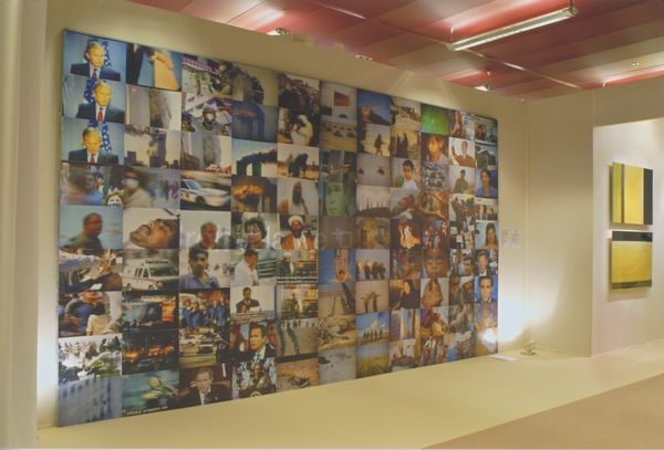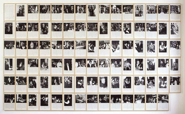 Curator: We're looking at Allen Ruppersberg's "Where's Al?" created in 1972, a mixed-media installation that's predominantly collage and photography. My immediate thought is how deceptively simple it appears. The sheer repetition almost lulls you into a state of calm. Editor: I agree about the simplicity but calm isn't my first reaction. To me, the grid of identical units conveys an obsessive, almost archival impulse. It begs the question, who is Al, and why this accumulation? Is it about absence or perhaps the illusion of knowing someone through fragments? Curator: Interesting. Given Ruppersberg’s ties to conceptual art and pop art, I see it more as an exploration of mass production and the very idea of authorship. Each unit, comprised of photos and text, becomes a reproducible commodity. The labor invested in creating these individual pieces versus the final seemingly effortless display makes me consider it in line with work such as Warhol’s assembly-line method. Editor: But that insistence on absence – the title implies we *should* be looking for something. Consider also that photography, from its earliest forms, was tied to memory and preservation of the dead or absent. There is this deep emotional link between the photographic image and what is missing or has been lost. "Al" takes on a significance even without context. It might symbolize loss, absence, the human condition reduced to an easily reproducible, disposable image. Curator: Perhaps. Or consider the banality of the photos, often candid snapshots, implying the ‘everyman,’ reinforcing a focus on the means of production—photography, collage, simple acts that speak volumes about the industrial age. Ruppersberg uses found or reproducible imagery challenging the cult of the original, which aligns it within Pop and conceptual art’s project of disrupting conventional methods. Editor: That reading reduces "Al" to pure materiality. Maybe there's room to see both. An emphasis on mass production does not exclude those psychological readings. I still find that accumulation hints at some deeper underlying symbolism. Curator: I suppose, and perhaps that ambiguity is precisely the point. Whether mass-produced commodity or vessel for memory, Ruppersberg delivers a surprisingly powerful image with extraordinarily basic means. Editor: Precisely. It’s a ghost in the machine; an elusive person at the intersection of industry and memory, captured through modest materials with lingering resonance.