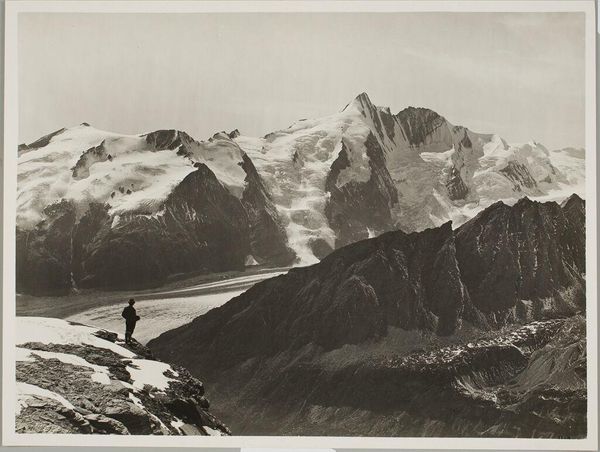 Editor: Robert Frank’s gelatin silver print, "Hiker--Sports," made sometime between 1941 and 1945, presents a lone hiker against an imposing mountain. I'm struck by the sheer scale of the landscape, how small the person looks in comparison. What catches your eye about this work? Curator: Well, aren't we all just minuscule specs against the grand tapestry of time and mountains? This image whispers tales of human endeavor against nature's might, a very old story that still feels very fresh, doesn’t it? The lone figure... Do you see determination in that silhouette or a quiet meditation? Editor: Hmm, maybe both? Determination to reach the top, but also quiet awe in the face of something so vast. Does the fact that it’s a photograph, rather than a painting, change how we read that relationship between person and mountain? Curator: Ah, that's the rub, isn't it? Photography has this raw immediacy. It feels "real" in a way painting can sidestep. It forces you to confront the… humility, shall we say… inherent in being a fleeting human on this planet. But then, Frank isn't *just* documenting, is he? There’s a feeling. Editor: So, it's not *just* a landscape picture, it is… almost symbolic? The person against nature. Curator: Precisely! Perhaps a quest? Maybe facing a personal challenge, symbolized by the climb? Art finds its best resonance within us, the individual viewer and our messy collection of lived experiences. Editor: That’s given me a totally different way to think about this photograph; less about the sport, more about… life’s journey. Curator: And isn't it delightful when a simple hike becomes a metaphor for… well, everything? Keeps things interesting, wouldn’t you say?