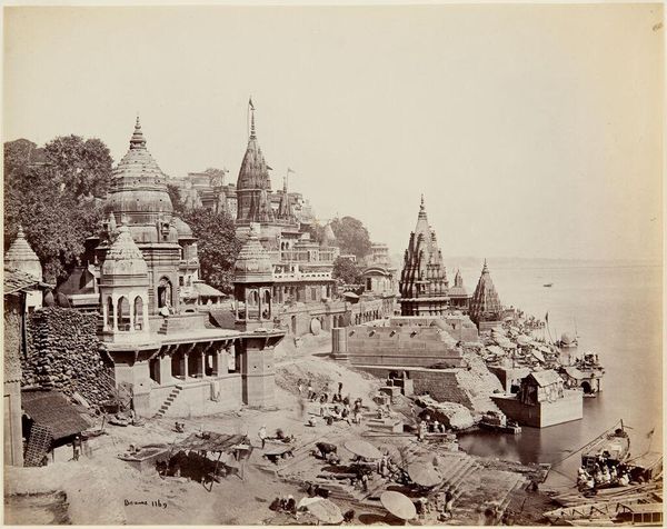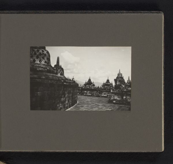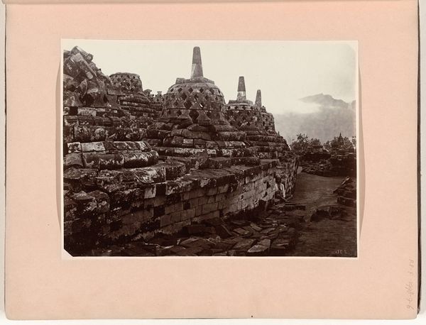 Curator: This albumen print, created sometime between 1875 and 1890, presents us with the upper reaches of Borobudur. The photographer, C. Dietrich, captured this landscape view of the ancient architecture. Editor: Oh, wow, I feel immediately grounded looking at it. There's such weight, not just of the stone, but of time itself. Like I’m peeking into a world that's both incredibly solid and ephemeral. Curator: That's a beautiful observation. Borobudur, a Mahayana Buddhist temple, holds immense historical and cultural significance. It's fascinating to consider how this image intersects with colonial history, too. The act of documenting such sites by European photographers was very much a part of constructing a particular vision of the East. Editor: Right, it’s layered, isn’t it? I'm curious about the way the light falls on the stone. It creates these lovely pockets of shadow and highlight that gives them this really tactile, almost breathing quality. Curator: Indeed. And if you think about the craftsmanship of these ancient structures alongside the development of photography as a tool of record, you can start to investigate questions around authenticity, representation, and power dynamics. Editor: It makes you wonder about Dietrich’s intentions too. Did he see this place with reverence, as a sublime encounter? Or as another subject to categorize, contain within the frame? The tones here really create an atmospheric quality. Curator: These questions are precisely what makes this photograph so compelling. The materiality of the print itself contributes to the reading as well. It becomes a historical object documenting a historical object through a colonial lens, if you will. Editor: Yes! So, you see that the image holds both the serenity of the structure, its imposing mass, and a sense of something complex beneath the surface—like this almost buried story we keep wanting to unearth. Curator: I couldn’t agree more. The photograph acts as a fascinating document to interrogate the relationship between art, history, and power, inviting a more nuanced discussion of Borobudur's place in our understanding of the world. Editor: This photo feels both distant and strangely intimate now, reminding us that even views of places we've never seen hold countless stories to tell, about art, power, and perspective.