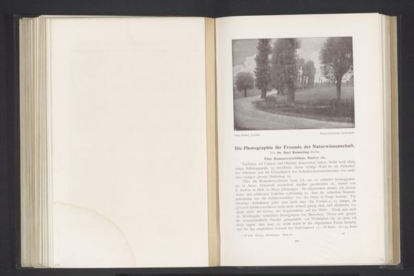 Curator: Looking at this early 20th-century photograph titled "Landweg met bomen, met op de achtergrond een huis," or "Country Road with Trees, with a House in the Background" by Albert Gottheil, I'm struck by its ethereal, almost dreamlike quality. Editor: Yes, that tonality gives it an immediate nostalgic quality. I'm drawn to the grainy texture of the print and how it speaks to early photographic processes and labor of production. Curator: Notice the road dominating the composition. It pulls you into the scene, doesn't it? A road can often symbolize a journey, or passage of time. Perhaps Gottheil is using it to represent a turning point. Editor: A turning point... possibly reflecting the societal shifts happening at the time through changes in agricultural technology, or the developing infrastructure that could alter lives of these villagers depicted? I’d be curious to examine if the material constraints of early photography such as developing practices or available paper played a role in generating the grainy texture and how it contrasts with other pictorialist artworks. Curator: Certainly, this grainy, almost blurred quality is characteristic of pictorialism, and its pursuit of artful imagery through soft focus and hand-manipulation in printing. Perhaps Gottheil aims to elevate photography to fine art status. The house in the distance, it reads almost like a beacon. I am not sure if it has particular symbolic or historic implications. Editor: Well, think about the cost involved in maintaining houses, printing photographs, even traversing a landscape by road in this era. Focusing on material accessibility reminds us that art historical interpretations of this landscape painting through iconographic study would perhaps differ greatly compared to someone inhabiting that physical space back then, who are burdened by labor and ownership issues. Curator: True, a good point. Editor: Analyzing how the artist uses technology in photographic printing, or if the workers or dwellers that populate these images have control or ownership over material, these considerations help disrupt conventional notions behind pictorial value in art history. Curator: Thinking about it that way has offered new insight into what this photograph represents. Editor: Agreed, this piece reveals the layers embedded within this single image, blending technical creation with enduring symbols and cultural interpretations, which only expands my perspective towards a piece such as this one.