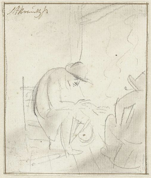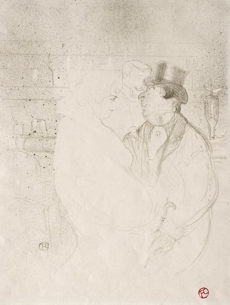 Editor: This is "Declaration of Love," a pencil drawing by Jean-Louis Forain. It's really just a sketch, so light it almost disappears. There is such hesitancy in the work that evokes the quiet dynamics of the *fin de siècle*. How would you interpret it? Curator: The sketch's lightness isn't just aesthetic; it reflects a broader shift in how art represented social life. Forain captured the bourgeoisie in morally ambiguous situations and in the liminal spaces that gave rise to class and gender anxiety, such as theatre boxes or cafes. Note how these spaces provided settings for interactions, often illicit and whispered like the medium. Does this inform your interpretation? Editor: Absolutely. Thinking about public and private behaviors makes it appear voyeuristic. Like a secret being observed, even exposed. Does Forain use similar artistic tactics in other works? Curator: Frequently. Forain made many works commenting on the political corruption within the Third Republic, often using a very harsh realism, in contrast to this light rendering, as an instrument to unmask abuses of power. The social and the political become blurred. Why do you think he chooses this lighter aesthetic to describe love declarations? Editor: Perhaps because those personal moments, the beginnings of relationships, are themselves uncertain and ill-defined, at least initially. It underscores how personal spaces get created and policed by these overarching societal expectations. Curator: Precisely. And that relationship between power structures and intimate lives becomes very pronounced at this historical juncture. Thanks for the insightful conversation, it highlighted that relationship further for me! Editor: Thank you; that really made me rethink how socio-political factors determine the artist's choices, and their effects.