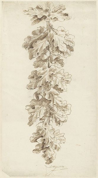 Curator: Hendrick Goltzius crafted this pen and ink drawing, "A Foxglove in Bloom", back in 1592. It's a marvel of detailed observation from the Northern Renaissance. Editor: Wow, it’s almost spooky, isn’t it? Stark, yet bursting with detail. You wouldn’t think a humble foxglove could feel so...powerful. Like a tiny cathedral. Curator: The effect arises from the artist's meticulous use of line and form. See how the strong verticality of the stem draws your eye upward, a counterpoint to the almost baroque flourish of the leaves below. The varying densities of cross-hatching provide shading, which suggests a kind of dynamism. Editor: Exactly! There’s this beautiful tension. Those drooping leaves contrast so strongly with the rigid stem. Like melancholy grounded by fierce determination. I keep thinking about how Goltzius managed to give a plant such presence using just ink. No colour, no tricks. Just observation. Curator: This absence of colour does not denote absence of expressiveness; indeed, the strategic void serves to isolate, highlight and foreground the natural form to a pristine state of objecthood. Its impact is one of near photographic verisimilitude. Editor: That reminds me of being a kid and pressing flowers between the pages of heavy books... Trying to stop time and capture something ephemeral. Maybe that's the heart of what Goltzius achieved here—a frozen moment that nevertheless throbs with life. The delicacy juxtaposed against that towering scale is just mesmerizing. I could stare at it for hours. Curator: Its stark, yet carefully executed naturalism presages an artistic sensibility yet to unfold. It’s a truly compelling piece to ruminate on. Editor: Absolutely, I keep imagining Goltzius with his quill, patiently chronicling this bloom. There's something profound about that quiet dedication and the bloom becomes like an allegory for his life’s devotion. A fitting testament.