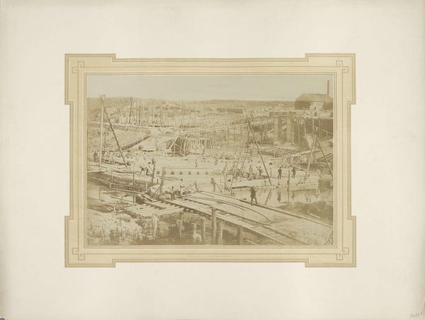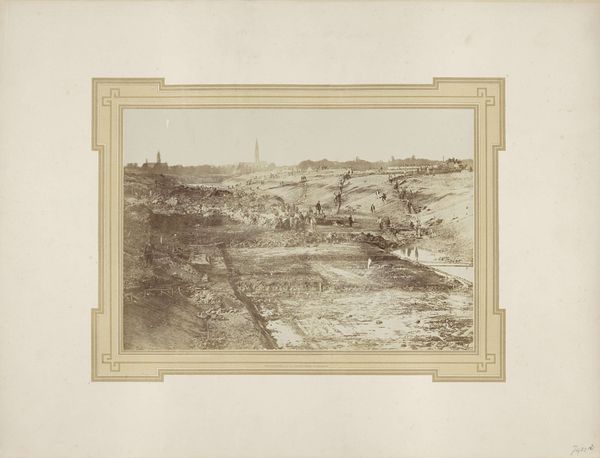 Editor: So, this albumen print is entitled "Aanleg (betonstorting) van de dubbele schutsluis te Vlissingen, 1869" by A.L. Preuninger. It feels documentary but there's a delicate quality to the sepia tones... almost a dreamy quality contrasting with the industrial subject. How would you interpret it? Curator: Ah, yes, the poetry of industry! I'm drawn to the way Preuninger frames this massive engineering feat as almost ephemeral. Notice how the soft focus and pale tones turn this very material process – pouring concrete, no less! – into something more akin to a fleeting vision. It reminds me that even the most "permanent" structures are just temporary blips in geological time. It also asks us, doesn't it, to reconsider our own role as builders and breakers? What do you think of the scale of the humans within it? Editor: That's really interesting. They are so small against the backdrop of construction! Perhaps it speaks to human ambition? To reshape the landscape? Curator: Precisely! But also perhaps our hubris. Don’t you get a feeling that while capturing progress, the picture might whisper a word of caution? It could almost be a stage set, waiting for some unforeseen drama. Editor: Yes, definitely. A stage where humans play out ambitions... Thanks, I hadn't considered it that way. It really adds layers to what I initially thought was a pretty straightforward industrial scene. Curator: That's the joy of art, isn't it? Revealing complexities where we expect simplicity. Editor: Exactly! It makes me want to explore photography from this period more deeply, searching for these surprising perspectives.