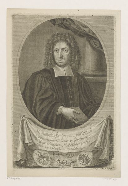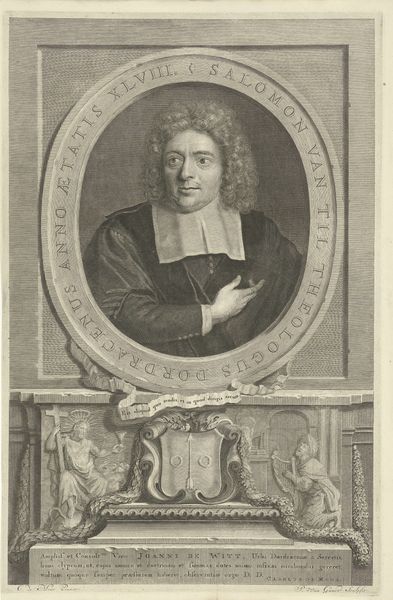 This is Christian Fritzsch's "Portret van Johann Bernhard Hassel," an engraving. The composition is dominated by Hassel's figure, rendered with meticulous detail through fine lines and cross-hatching. Note how the play of light and shadow defines the contours of his face and the folds of his garments, creating depth and volume. The texture, achieved through the engraving technique, adds a tactile quality to the portrait, inviting a close visual inspection. Consider how Fritzsch's technical skill elevates the subject, imbuing him with a sense of authority and intellectual weight. The formal elements of the artwork—the controlled lines, the balance of light and shadow, and the structured composition—serve not just as aesthetic devices but as cultural signifiers of status and knowledge. This work invites us to reflect on how portraiture can function as a form of cultural encoding.