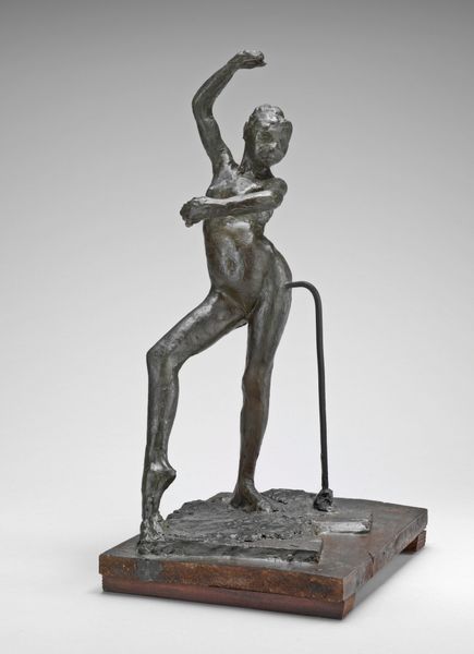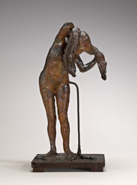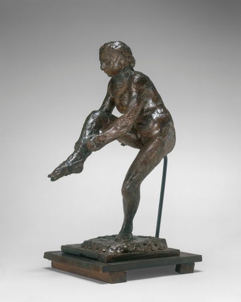 Curator: Standing before us is Edgar Degas' "Woman Arranging her Hair," a bronze sculpture crafted between 1895 and 1920, now residing at The Met. Editor: There’s such raw, unvarnished honesty in the gesture, isn't there? She’s so engrossed in this intimate ritual; I feel almost like I'm intruding on a private moment, yet drawn in at the same time. Curator: Degas, as you know, was fascinated by capturing women in unguarded moments. He defied conventions and aimed to present women without idealization, without that theatrical posturing we saw in salon art. He wanted that truth. Editor: That’s what gets me. There's a very modern, immediate feel to the work despite its age. You can almost feel the weight of her hair, the slight strain in her back. And bronze – cold, hard – made to feel so…alive. Curator: Degas was very interested in showing that. What's intriguing is how his works were shaped by his own elitist politics. For Degas and others like him, there was a kind of conservative anxiety that the domestic lives of the bourgeois and working classes was breaking down at this time and being opened to scrutiny. The modern art in their opinion should seek out and document such disruption. Editor: Huh, so this fascination was a document of societal anxieties? That reframes the viewing experience. All I see at first is just the simple beauty in the everyday. A woman and her hair, no drama or social statement intended, just a genuine moment captured for all time, yet there's a political reason that is part of its background... Curator: Absolutely, it gives nuance to Degas's artistic intention, how his art intersected with and expressed his cultural context. Degas' sculpture pushes our awareness of these complex relations between artistic production and conservative social norms. Editor: Which just shows art never exists in a bubble, does it? I walk away now, still seeing that woman struggling with her hair but knowing so much more. I feel oddly empowered. Curator: Agreed. These private sculptures give us so much, both what Degas intended and much that's born by how we're made to feel looking at this sculpture today. It speaks volumes.