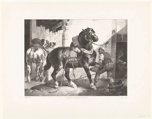 This print, "Een paard wordt beslagen," was created by Théodore Géricault using lithography, a process that democratized image-making in the 19th century. Lithography allowed for the relatively quick and inexpensive reproduction of images. The process involves drawing on a stone or metal plate with a greasy substance, then applying ink, which adheres only to the drawn areas. Here, Géricault captures the everyday scene of a horse being shod. Look closely, and you see the amount of labor involved: the farrier's focused effort, the horse's patient stance, and the equipment required for this essential task. The print suggests an awareness of the working class. By using lithography, Géricault made this image accessible to a wider audience. It challenges traditional distinctions between fine art and craft, emphasizing the importance of both materials and the social context in which art is created.
