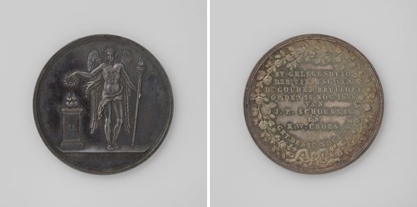 This medal by David van der Kellen, now residing at the Rijksmuseum, presents a study in contrasting symbolic designs. Composed of monochromatic silver, the medal offers two distinct visual fields. The primary side features a classical figure, possibly an allegorical representation of victory, rendered with a smooth, polished finish that accentuates the figure's draped form. This contrasts sharply with the reverse side, which displays an inscription encircled by a textured floral wreath, invoking a softer, more ornamental feel. The circular composition and the careful arrangement of text and floral motifs invite a reading of the medal as a semiotic object. The interplay between the classical figure on one side and the ornate text on the other prompts an interpretation of the medal's purpose: to commemorate and celebrate acts of heroism and sacrifice. It questions the nature of heroism through contrasting allegorical and textual representations. It challenges the viewer to reconcile these distinct visual languages and consider how they collectively construct a narrative of value and remembrance.